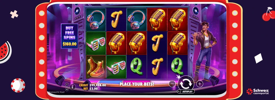 Mikrofon, Disco Schuhe, Kopfhörer, Disco Brille, Schallplatte und Boombox bilden die Gewinnsymbole, ergänzt durch Spielkarten Abzeichen. Die Gestaltung der Animationen und Effekte ist entsprechend bunt und blinkend, wie es sich für einen Disco Besuch gehört. Gewinn Kombinationen pulsieren im Takt der Musik und dramatische Lichteffekte setzen höhere Auszahlungen in Szene.