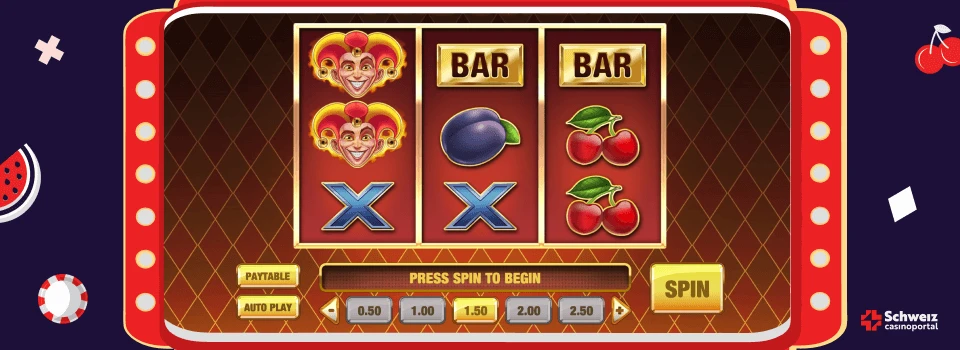 Du kannst pro Runde Beträge von CHF 0.05 bis CHF 100 setzen und so höchstens CHF 80’000. Das ist für moderne Verhältnisse bescheiden, jedoch spricht das Spektrum der Einsätze verschiedene Arten von Spielern an und das Risiko Profil ist entsprechend niedrig bis mittel. Um die Einsatzhöhe passend zu deinem Budget zu wählen, kannst du kostenlos die Fire Joker Slot Demo spielen.